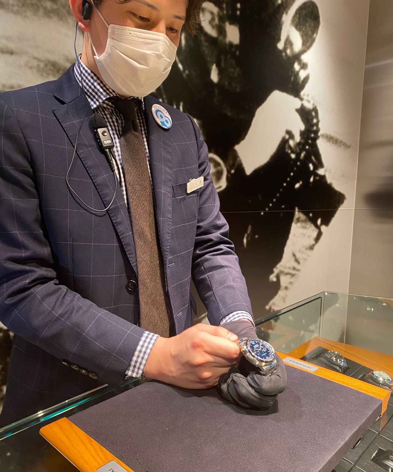 岡崎:そして一番のポイントがサンブラッシュ加工が施されたブルーの文字盤です。
