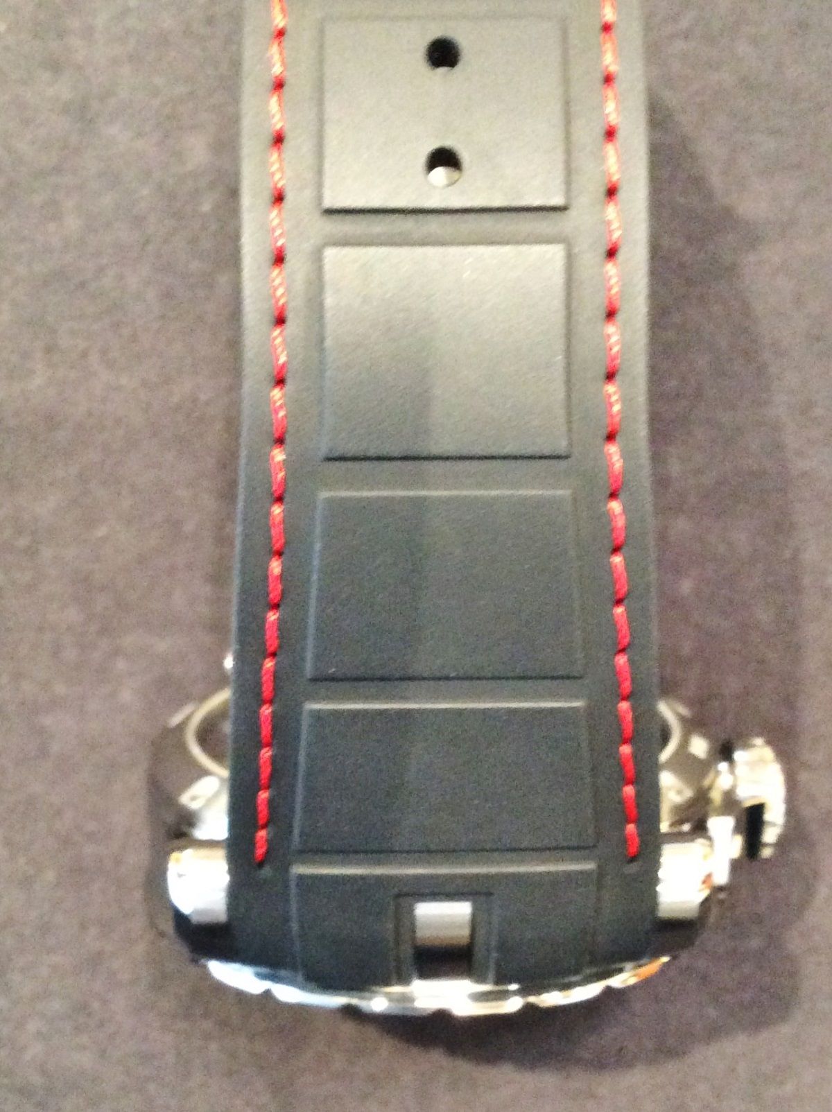 セッティングされるバンドは赤いステッチが魅力的なラバーバンド仕様、留め金はバックル仕様になっており、着脱も容易に、ラバーを痛める心配も少ないです!!