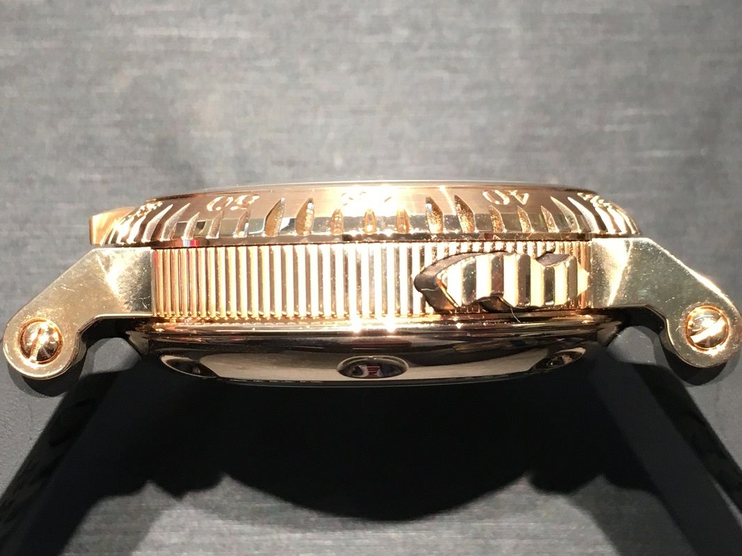 (李)そうですよね、ビックリしましたよね。 この「マリーン・ロイヤル」はシリーズの中でも、45mmサイズのローズゴールド仕様で、存在感抜群ですよ!
