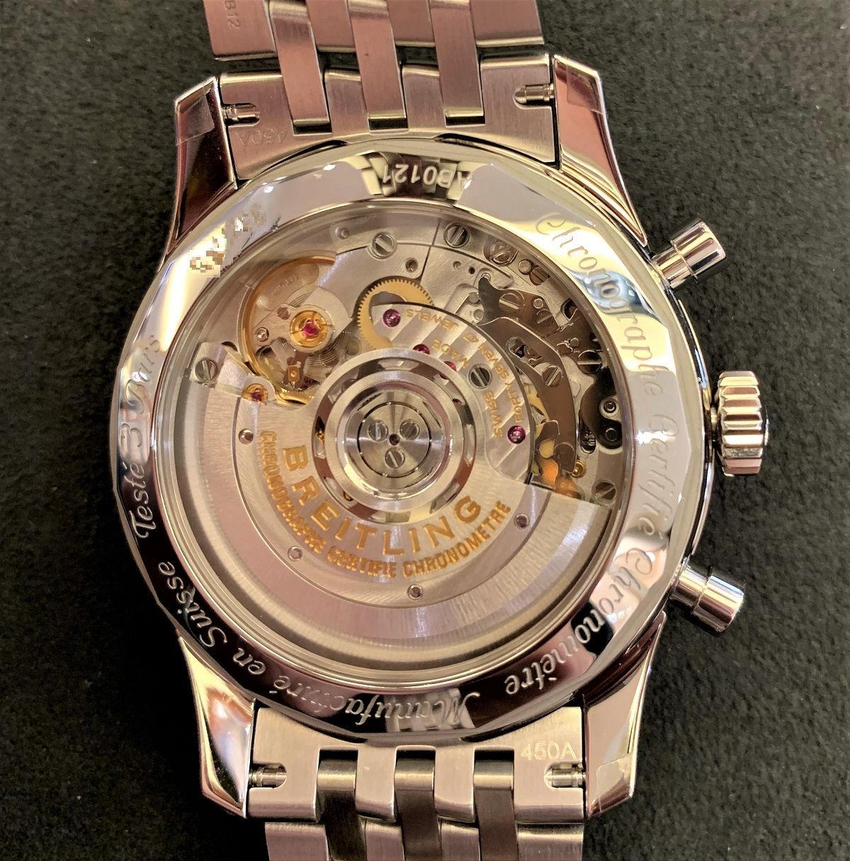 「内部に搭載のキャリバーB01は、ブライトリングの自社開発ムーブメントなんです‼」
