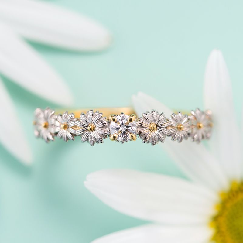 可憐なマーガレットの花の中に留まる美しいダイヤモンド