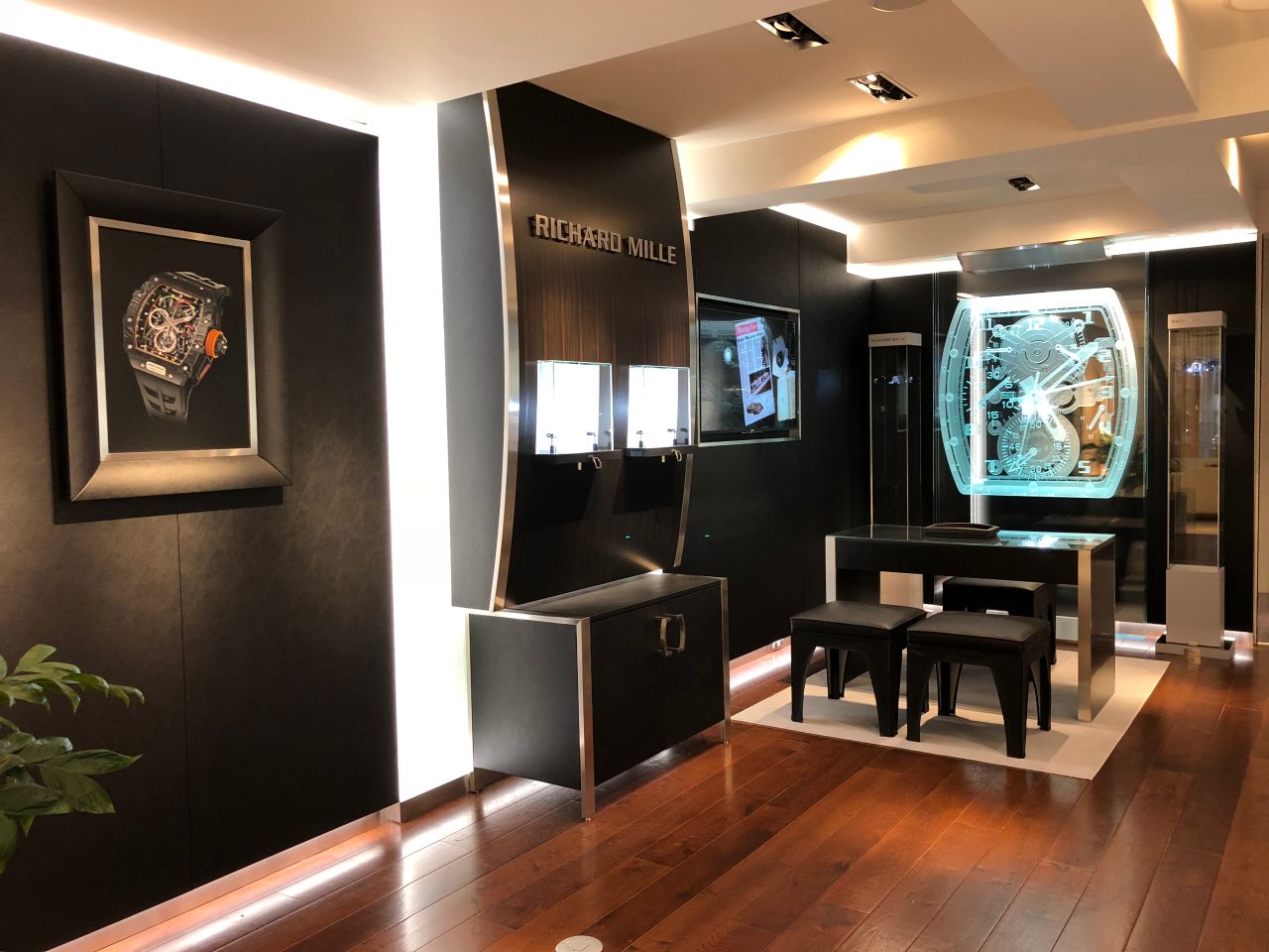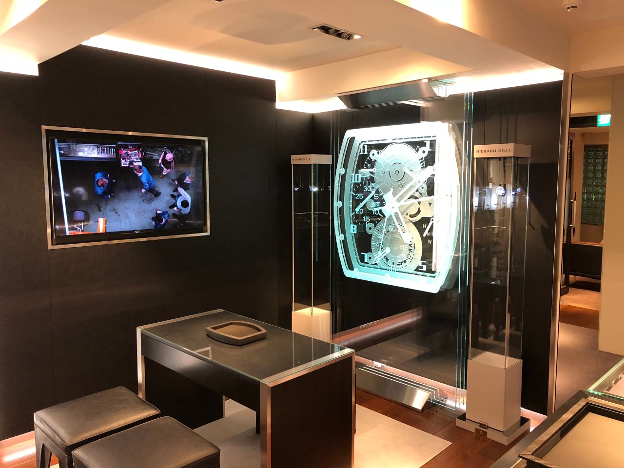 商談スペースの後ろにあり、3枚のガラスでリシャール・ミルの時計を作り上げています。