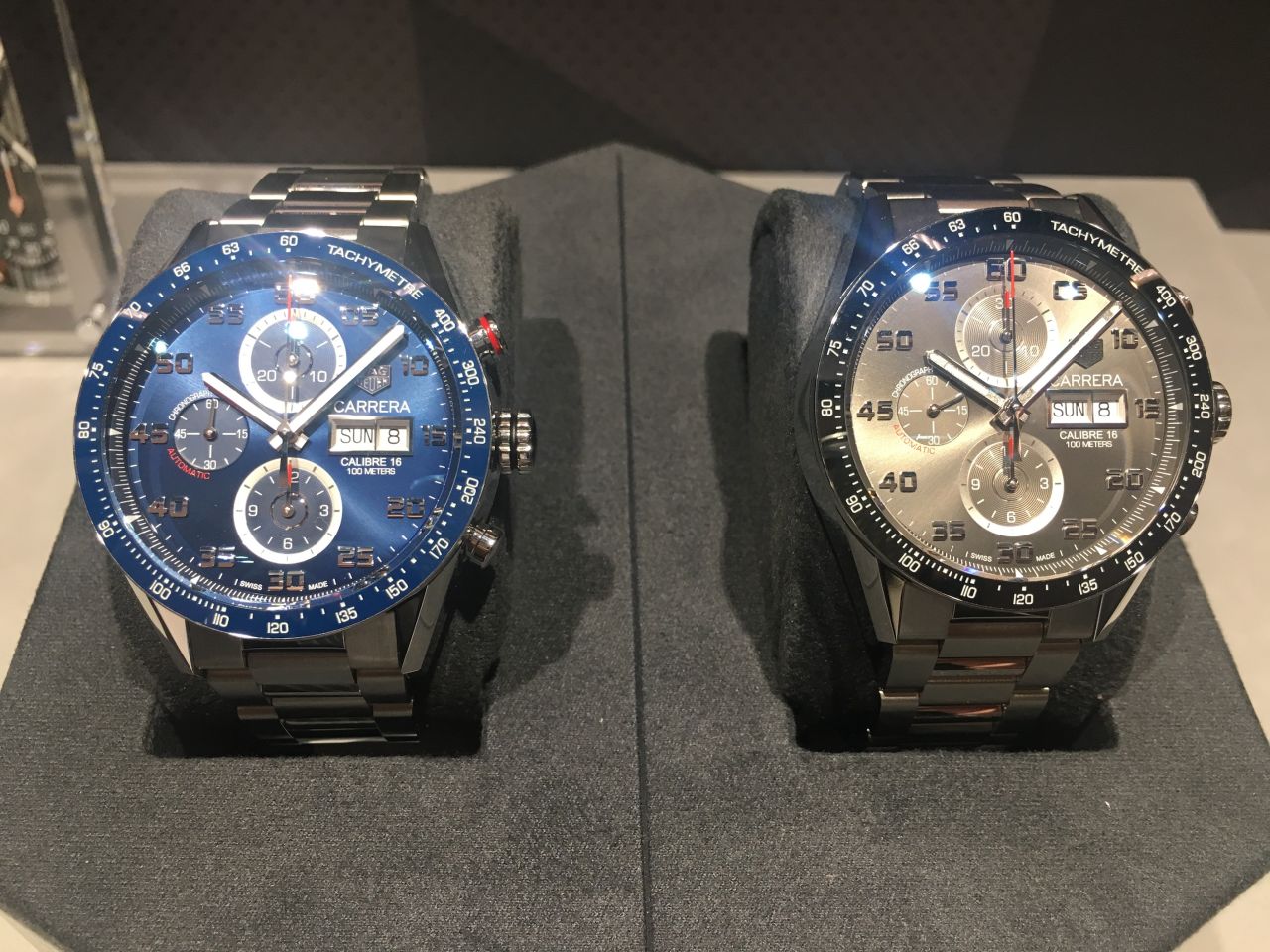 左:カレラ キャリバー16 クロノグラフ デイデイト ブルー