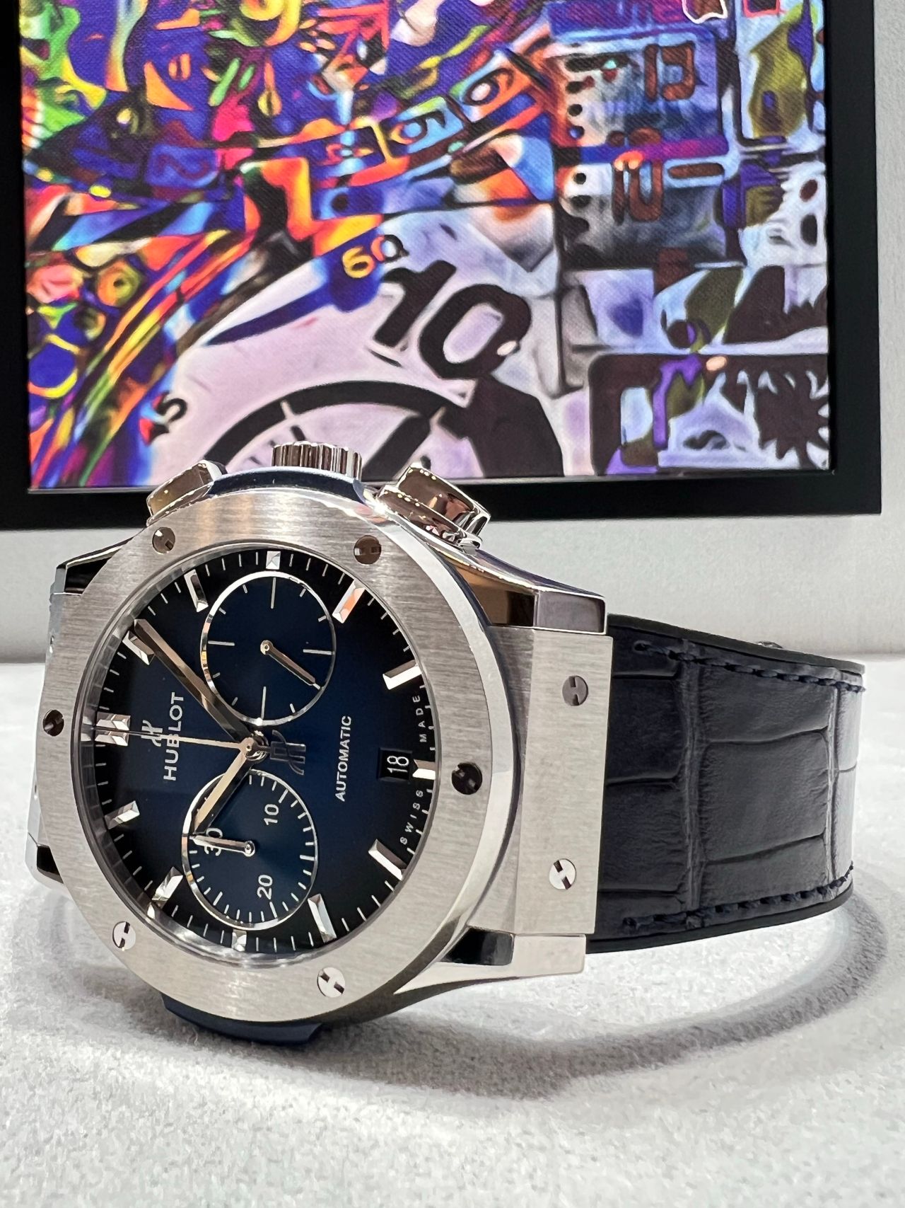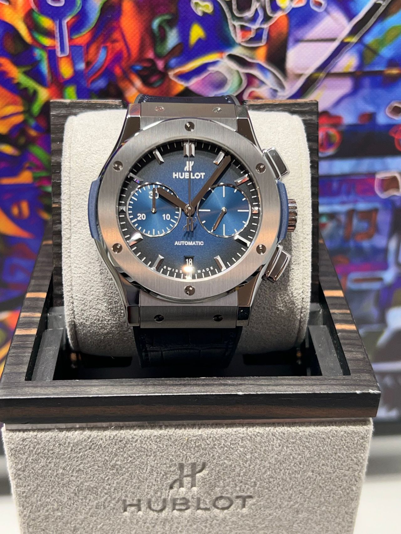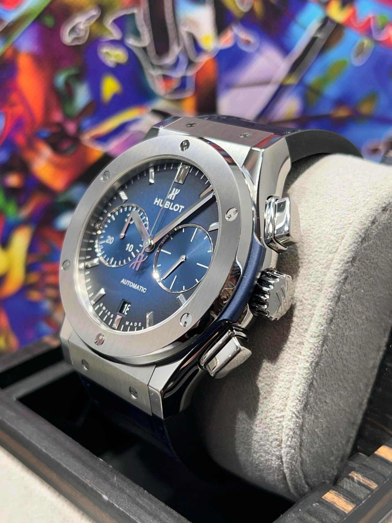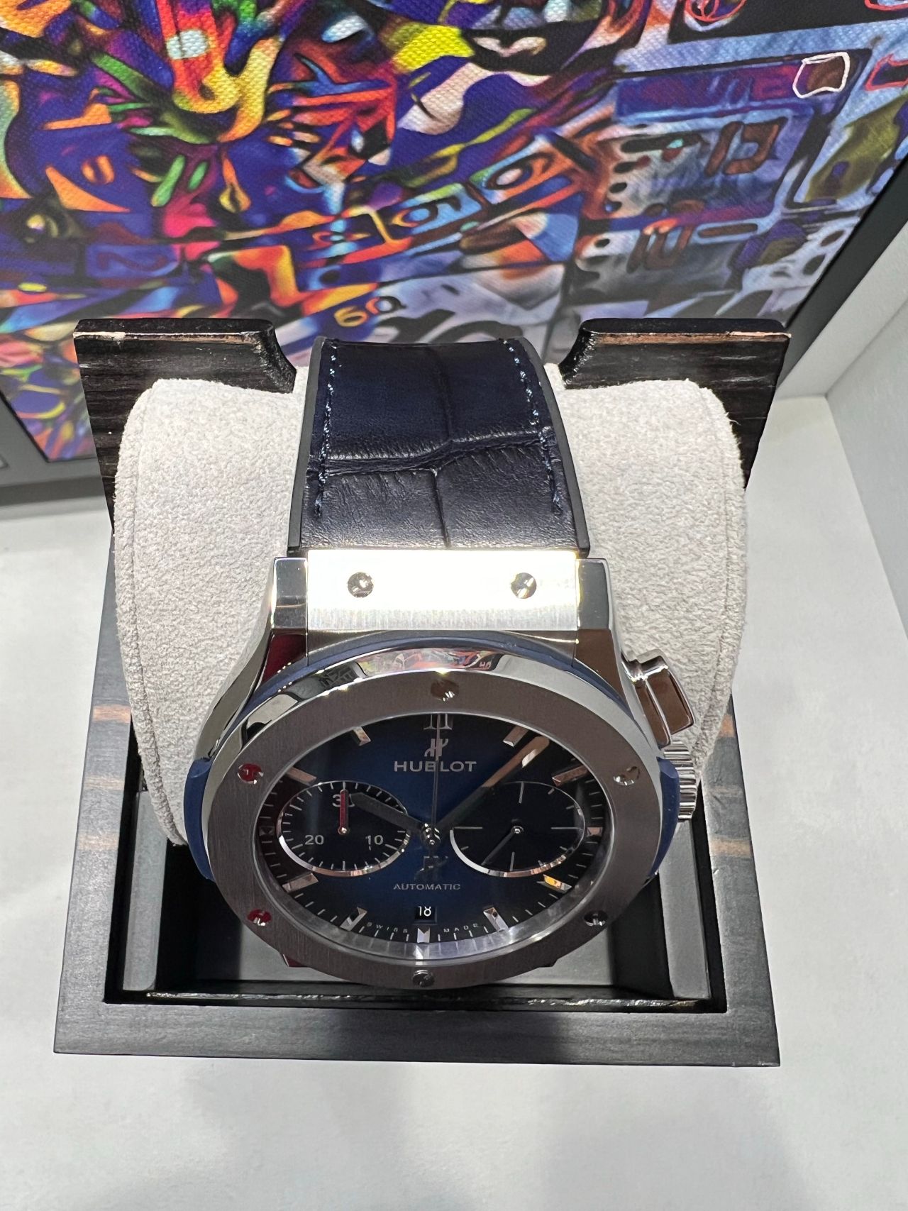 45mmのクロノグラフはスポーティ感は有りながら、絶妙な曲線を纏ったケースがHUBLOTらしいラグジュアリー感を演出し、着用される方の気分も高揚させてくれどこにお出掛けしようか、ウキウキワクワクの最高のアクセントになります♪