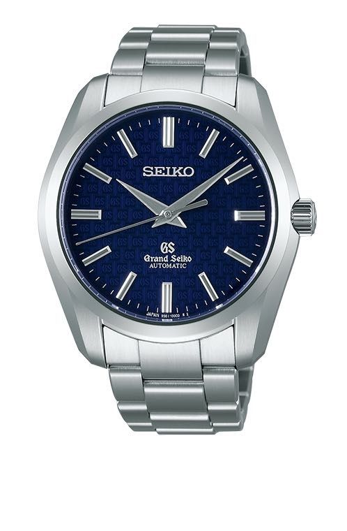 深みのあるグランドセイコーブルーの文字盤に、GSロゴがタイル状に敷き詰められた