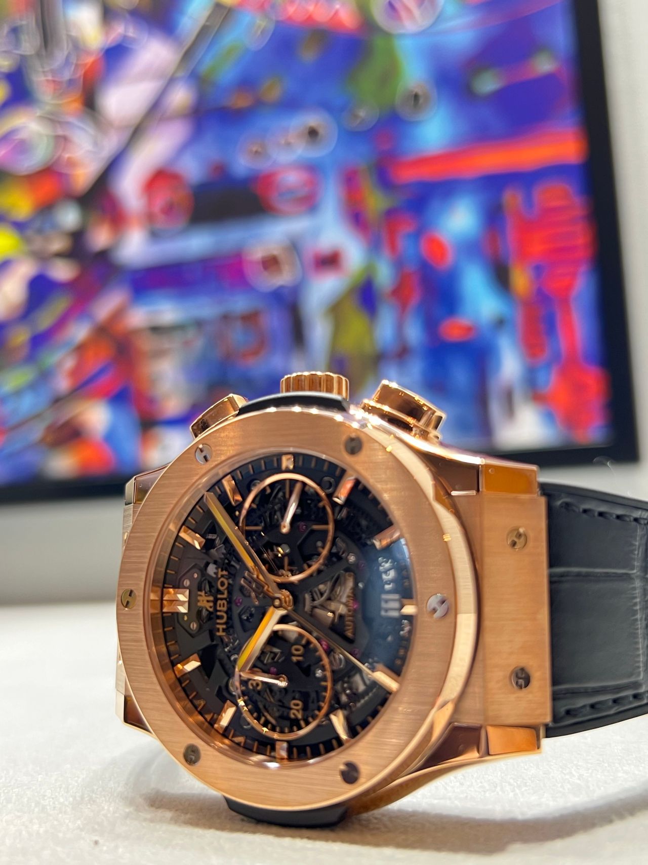 この45mmのクロノグラフはスポーティさはそのままに、文字盤をシースルーにしているのでエアリーな雰囲気と武骨なカッコよさが同居する、HUBLOTらしい時計に仕上がっております!