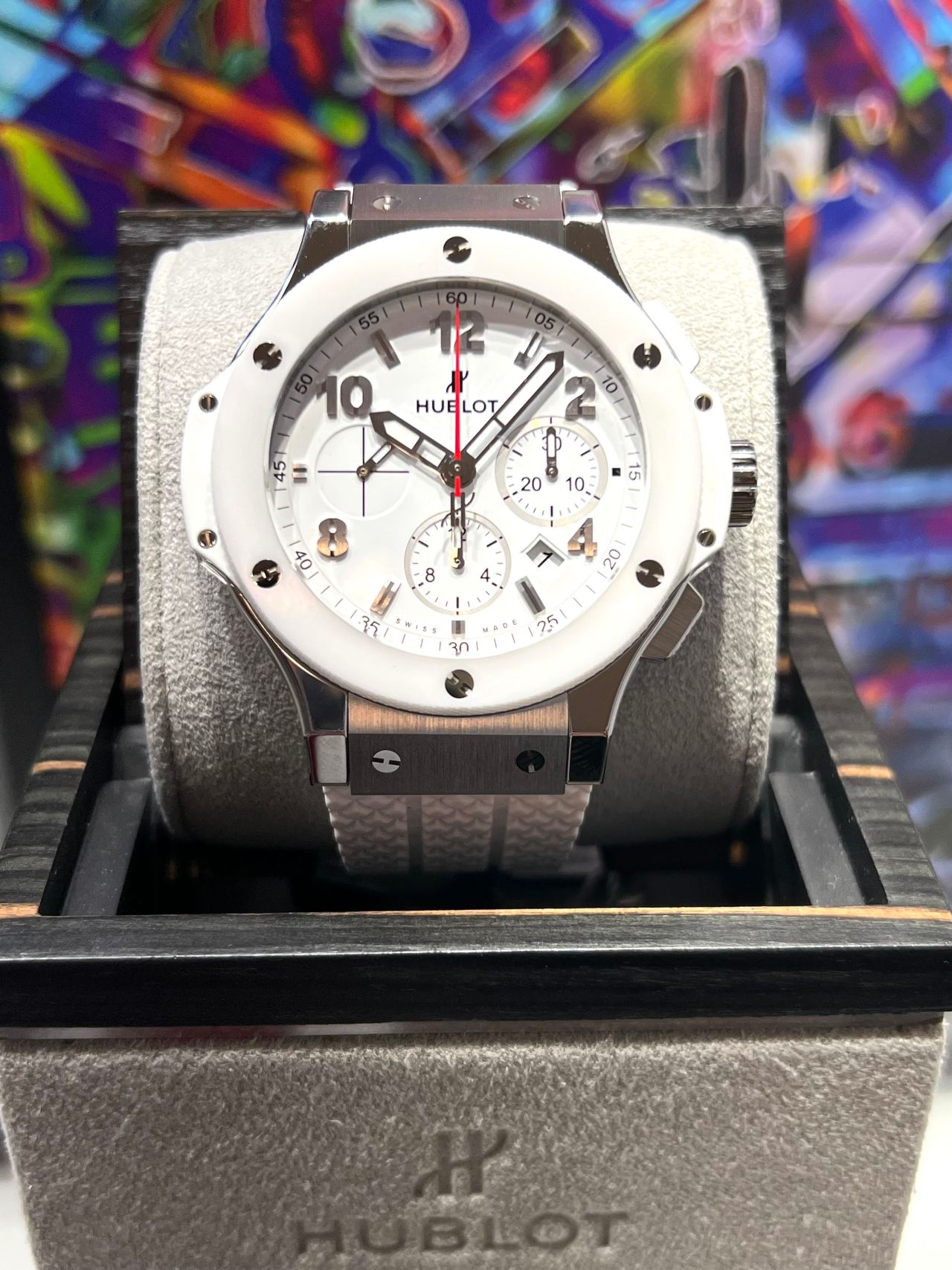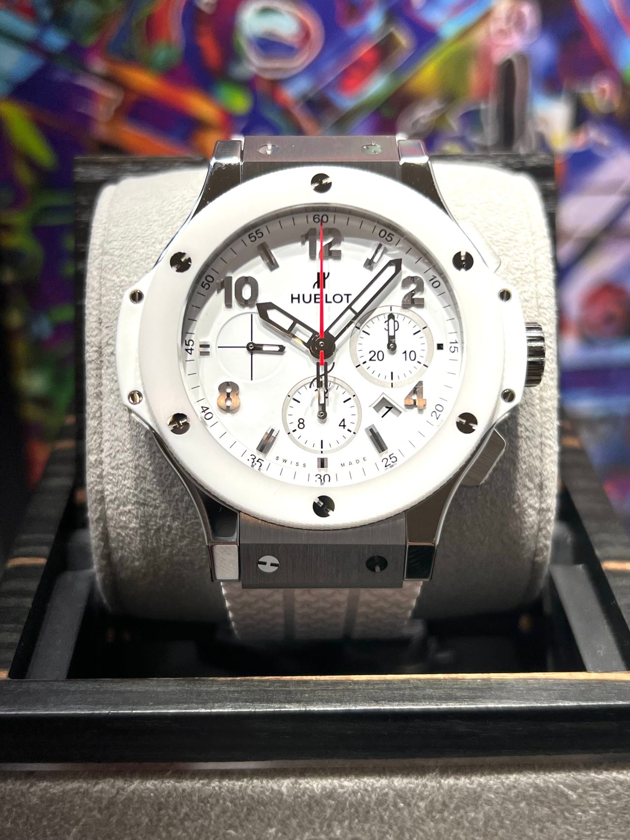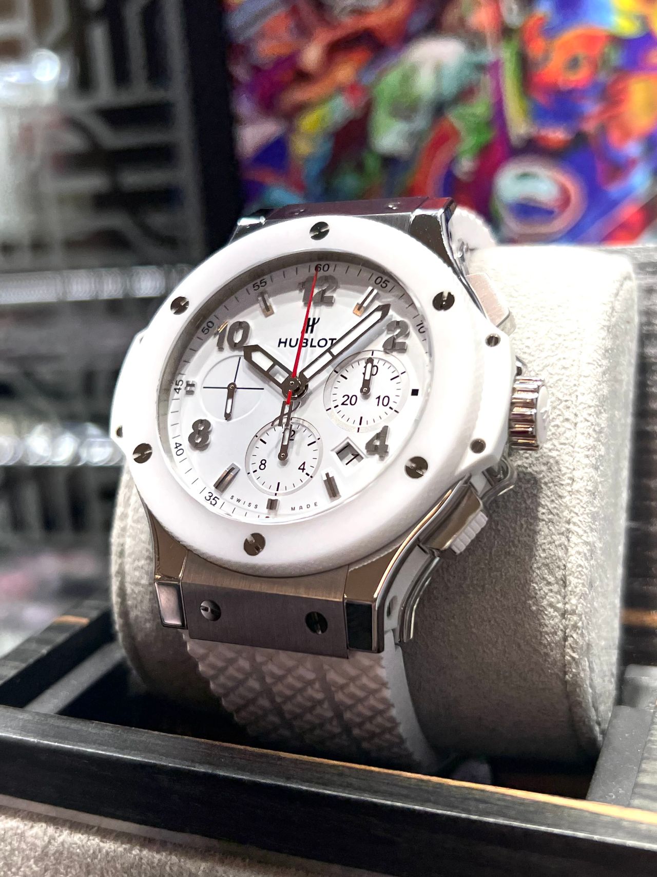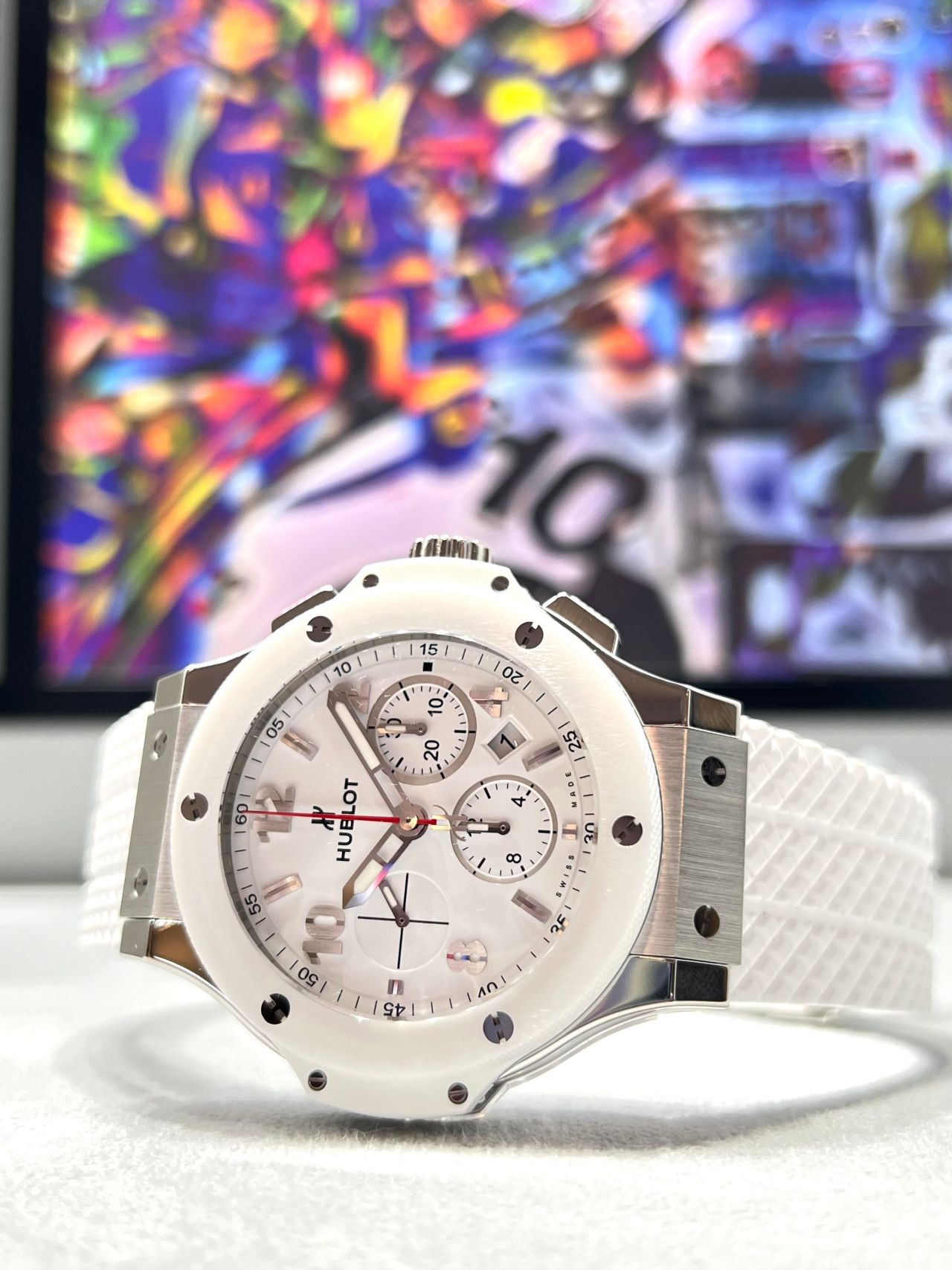 本来の44mmのクロノグラフはスポーティ感と武骨なカッコよさが有りますが、更にこちらのモデルはスイスの高級リゾート地サンモリッツの名前を名付けられる程、美しい雪景色のようなホワイトセラミックベゼルがエレガントさも出してくれ、