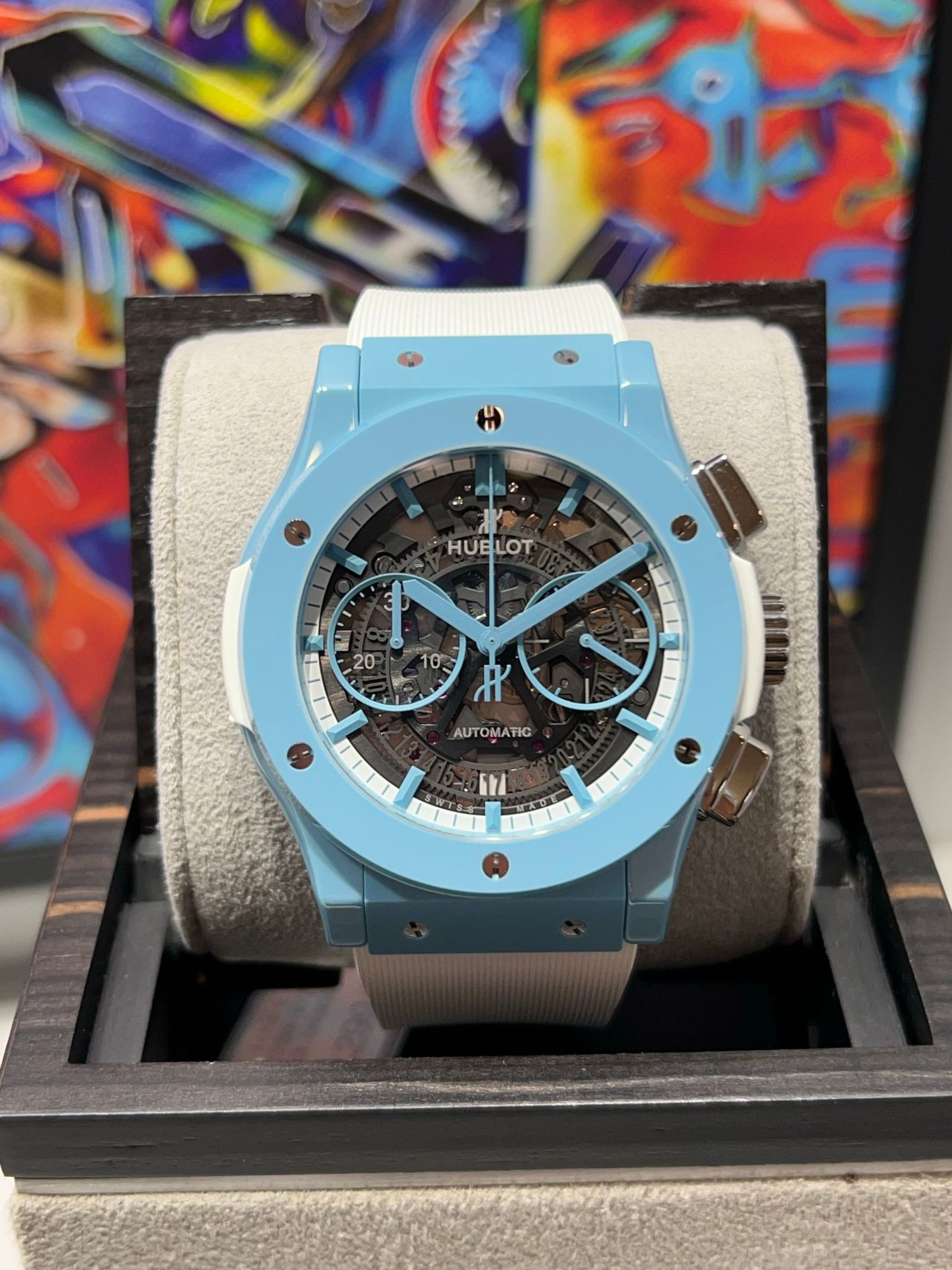 ブラックとチタンカラーを基調とした時計が多いウブロの中で、スカイブルーセラミックと言うとても綺麗で爽やかな時計を弊社トミヤの限定として販売しております!
