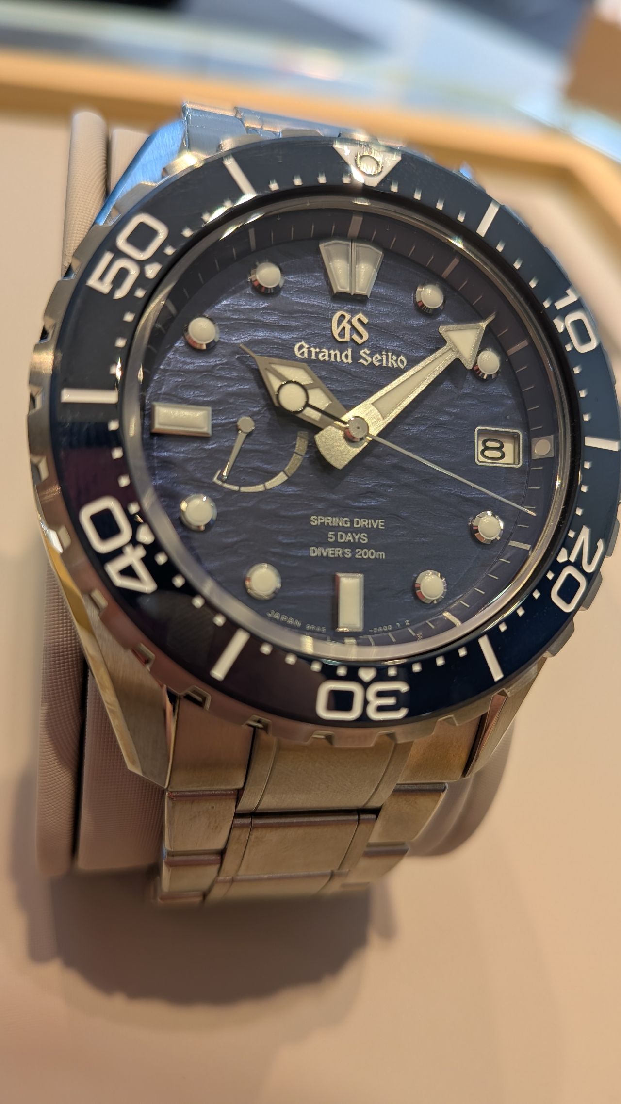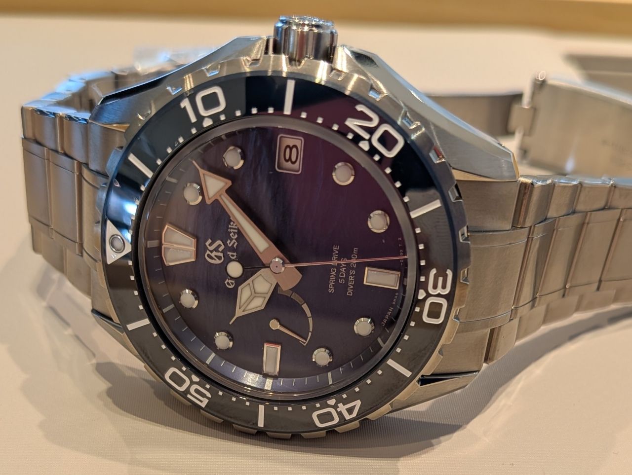 ベゼル部分に着色された、ブランドカラーである「グランドセイコーブルー」が特徴的ですね!