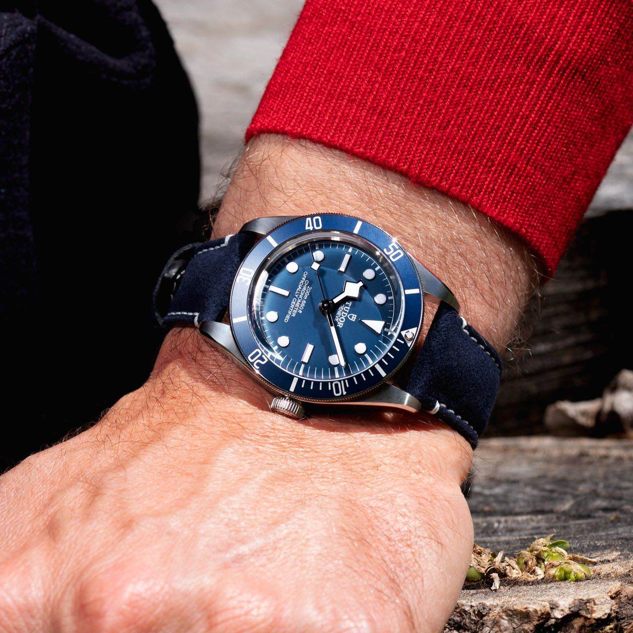 ブラック文字盤のカーフレザーと違い、ヴィンテージ感は程々にブルーのソフトタッチストラップはオシャレさや落ち着いた表情を出し、お手元を品良くまとめてくれます。