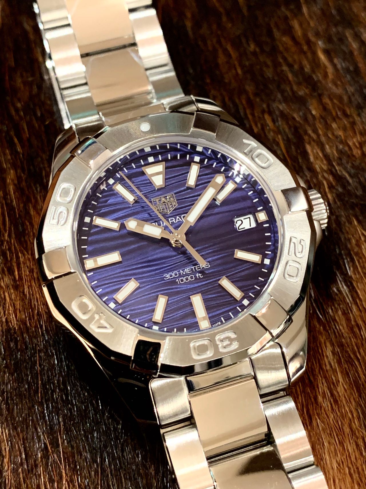 防水性もありながら、文字盤のブルーとおしゃれな彫りがスポーツエレガンスを表現。