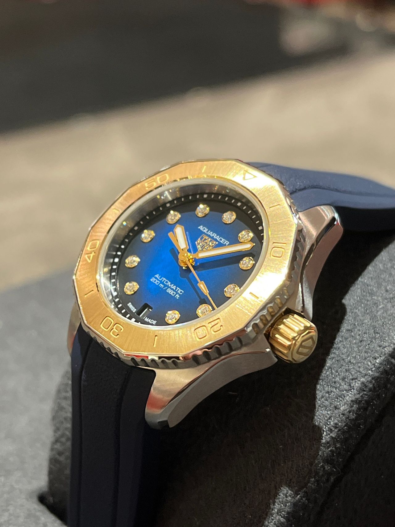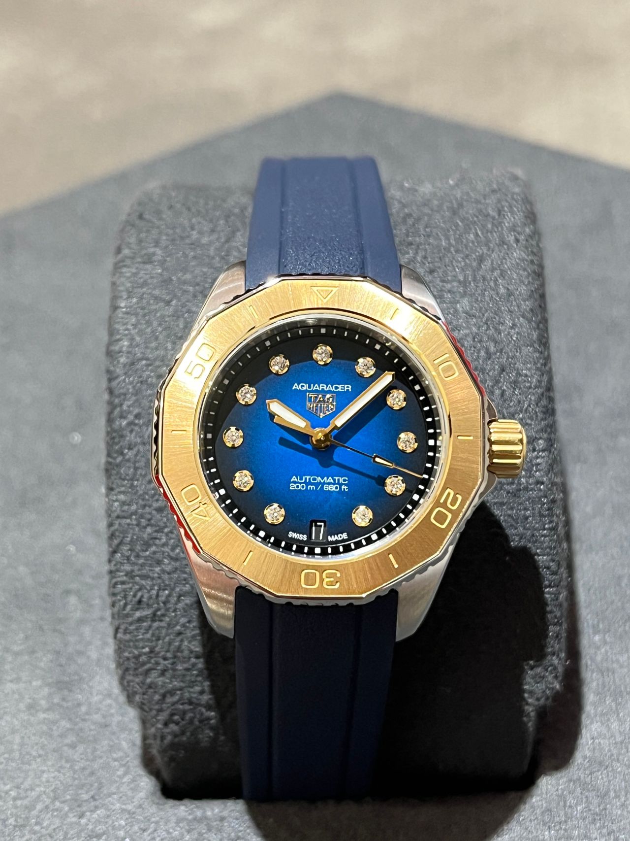 ゴールドベゼルとブルーMOPダイアルに施した12石のダイヤモンドがより一層