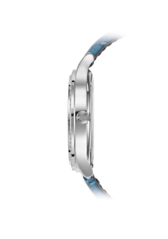 特に文字盤のブルーグレーとピーコックブルーのアリゲーター・バンドが