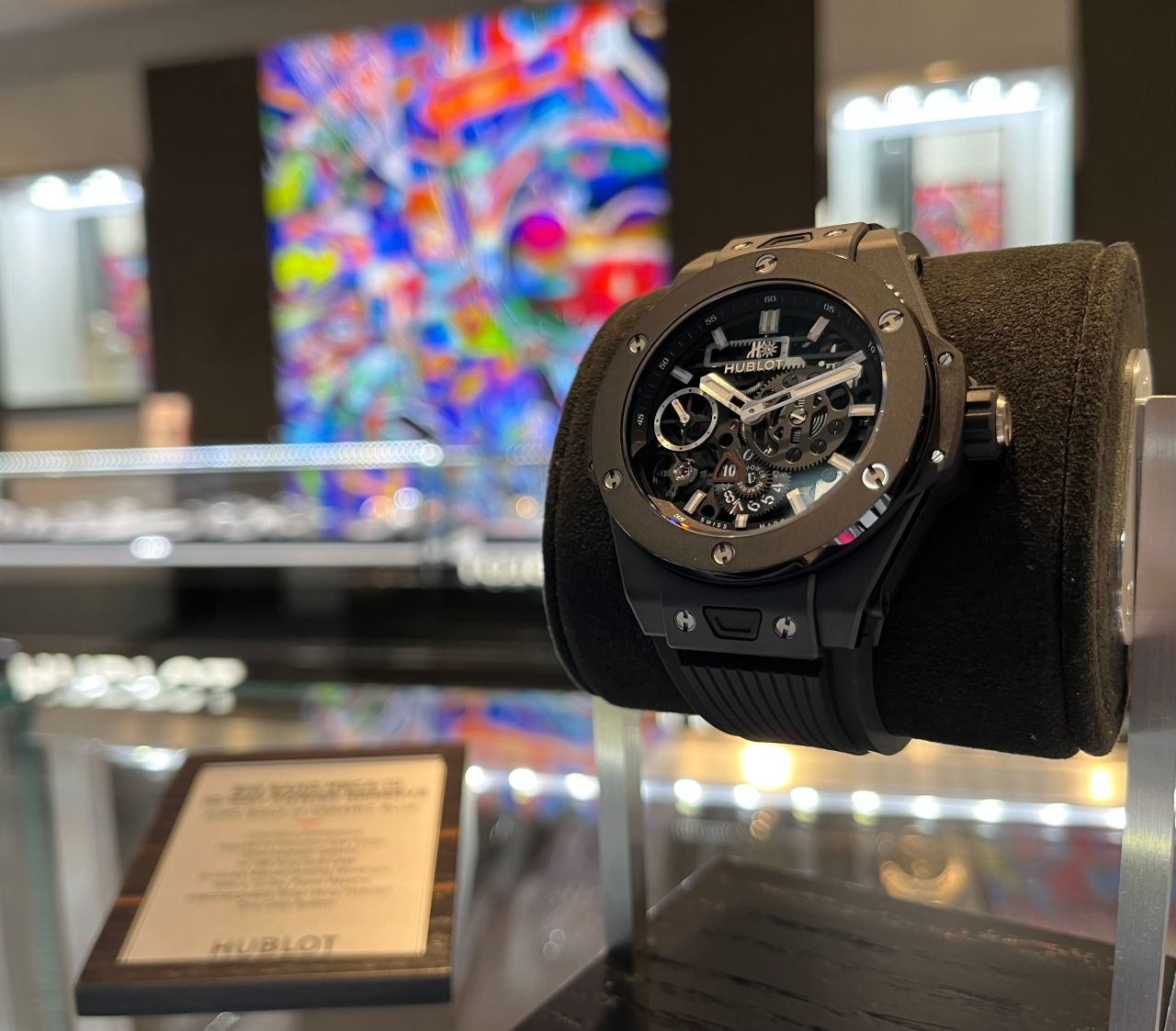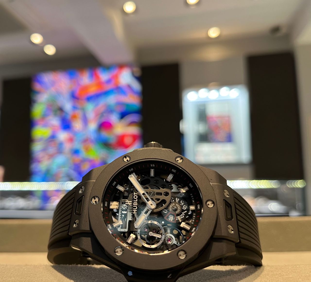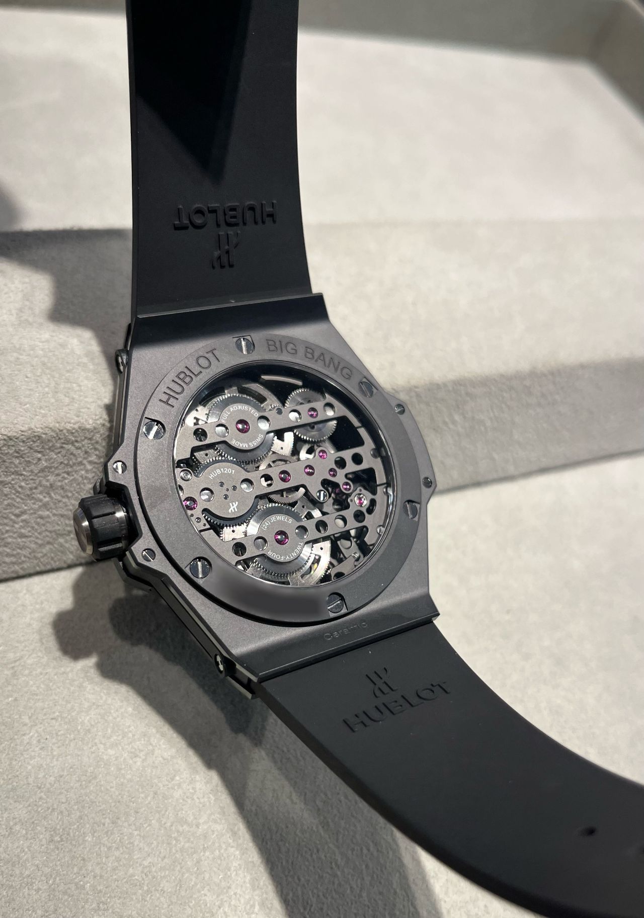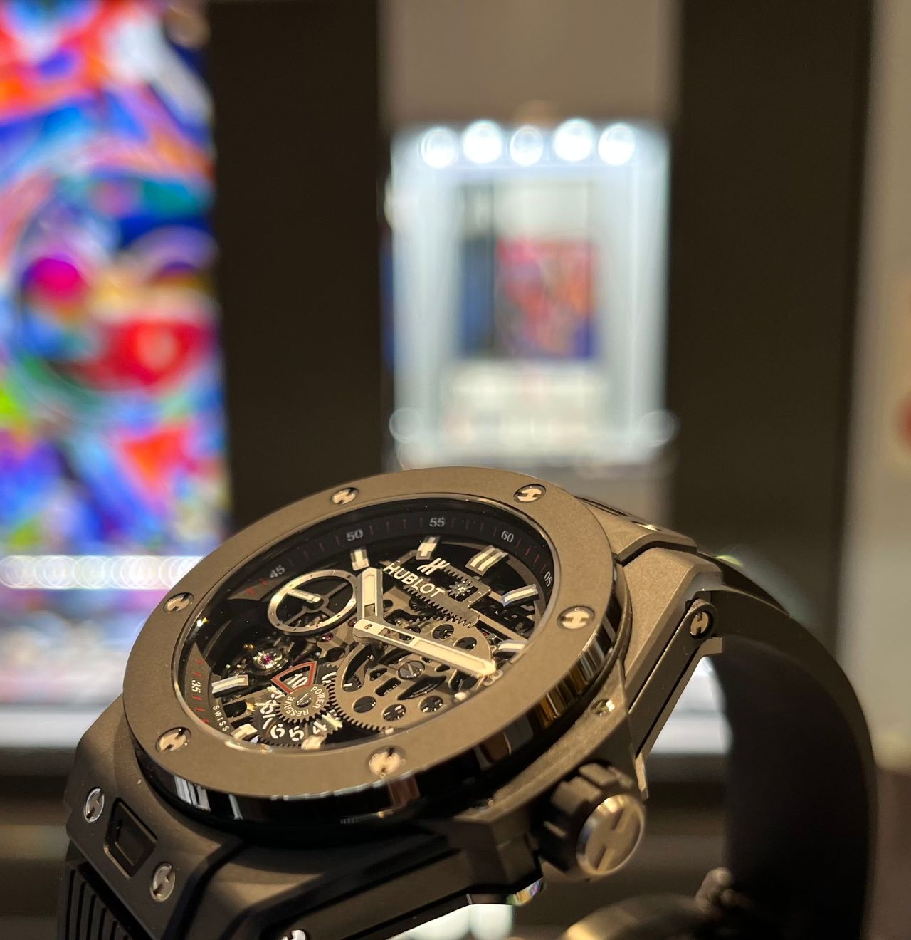 ケースはセラミックでマットな質感、内部機構や圧倒的なパワーリザーブは存在感、所有感ともにHUBLOTでも指折りのモデルです。