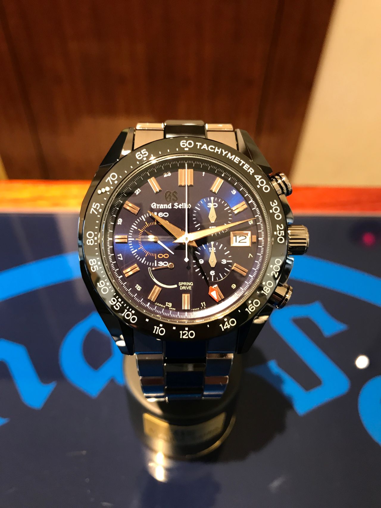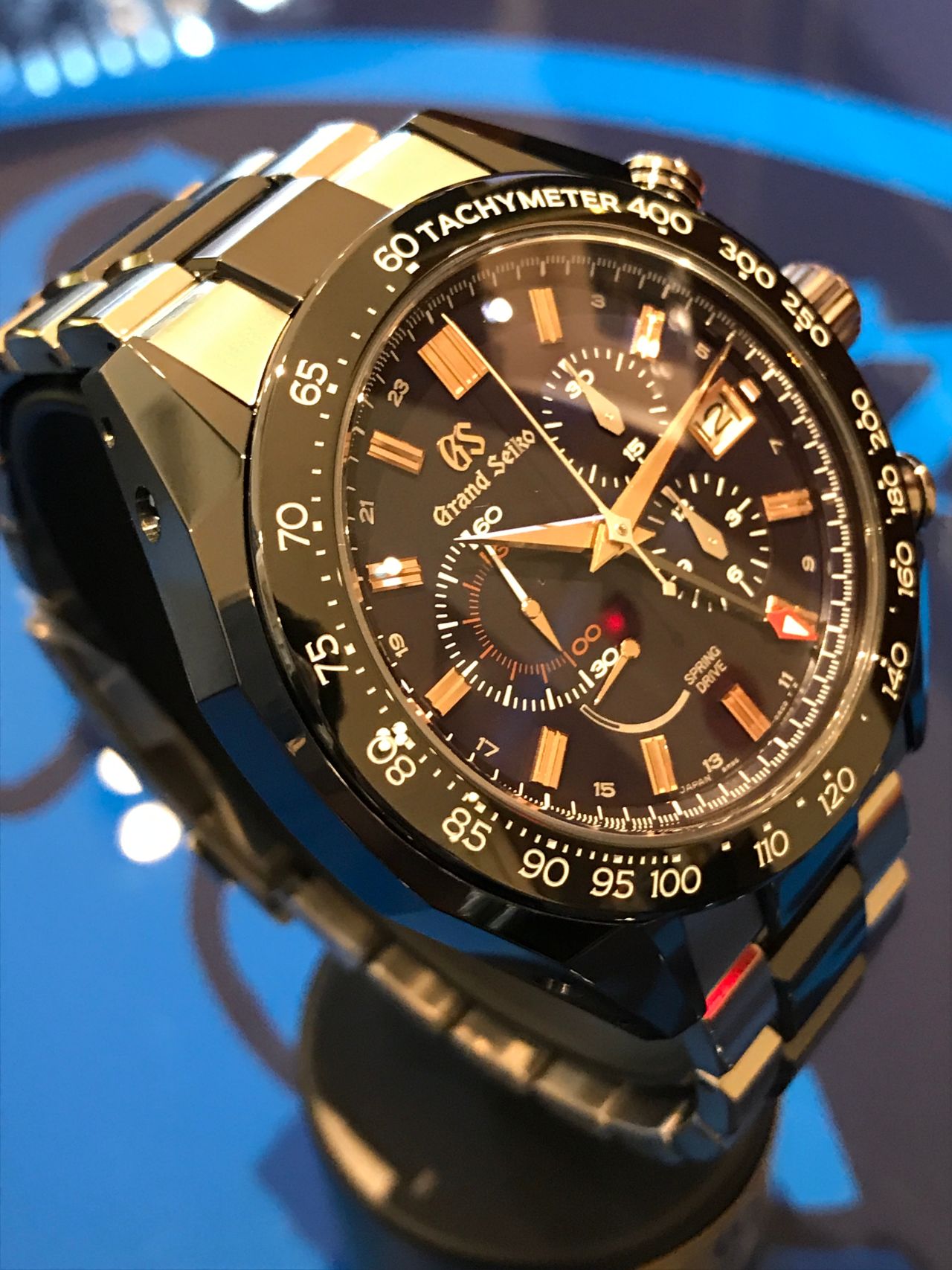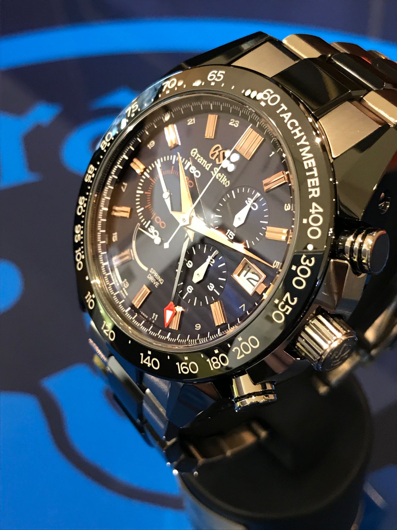 ブランドカラーである「グランドセイコーブルー」に18Kピンクゴールドの針とインデックスが映えるダイヤルデザイン、タキメーターつきベゼルは、限定モデルだけの特別意匠です。