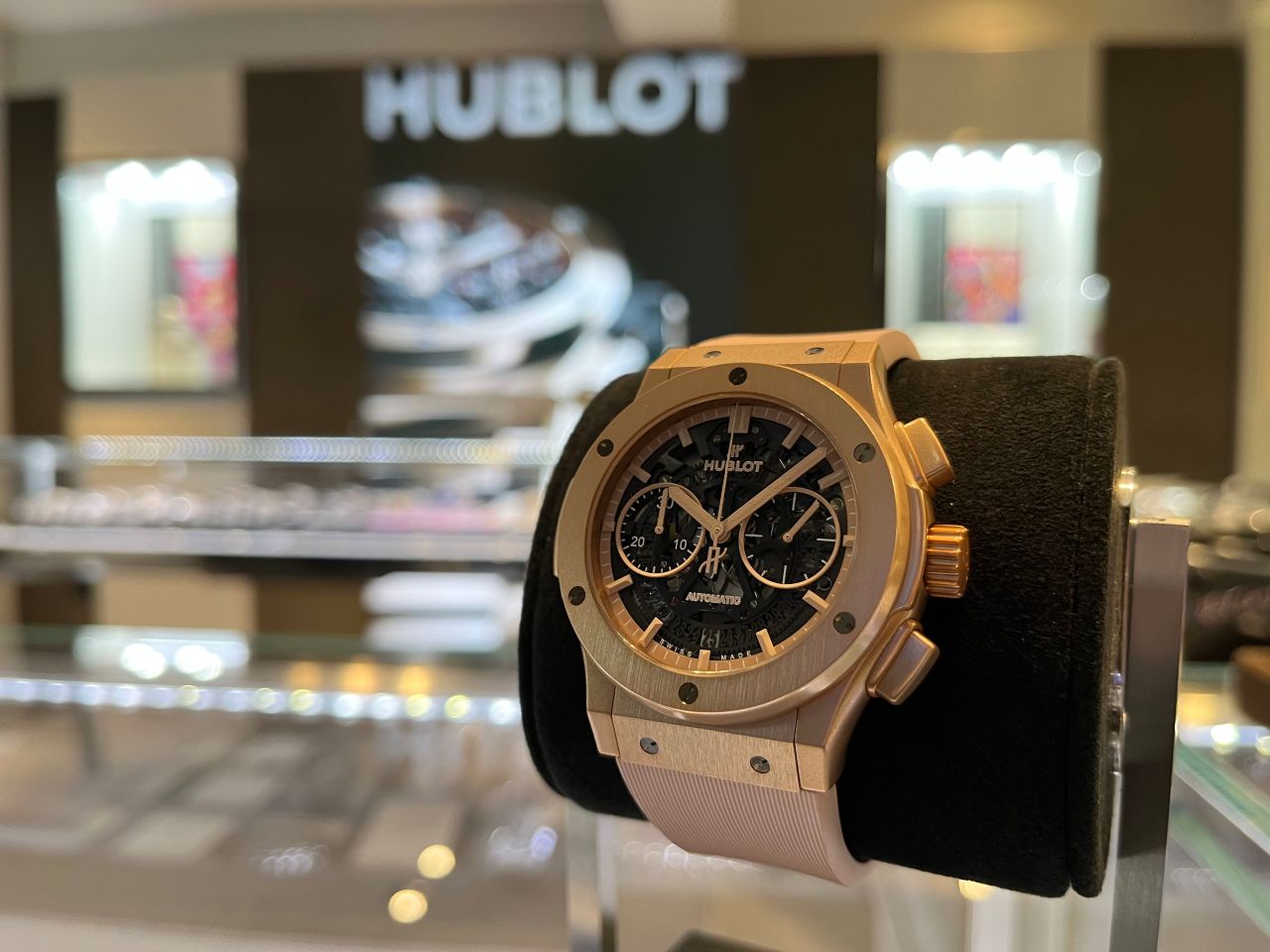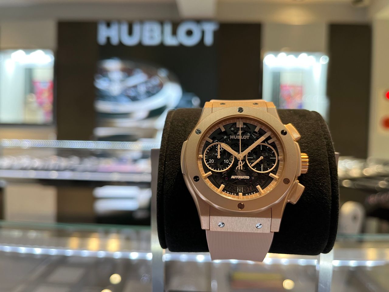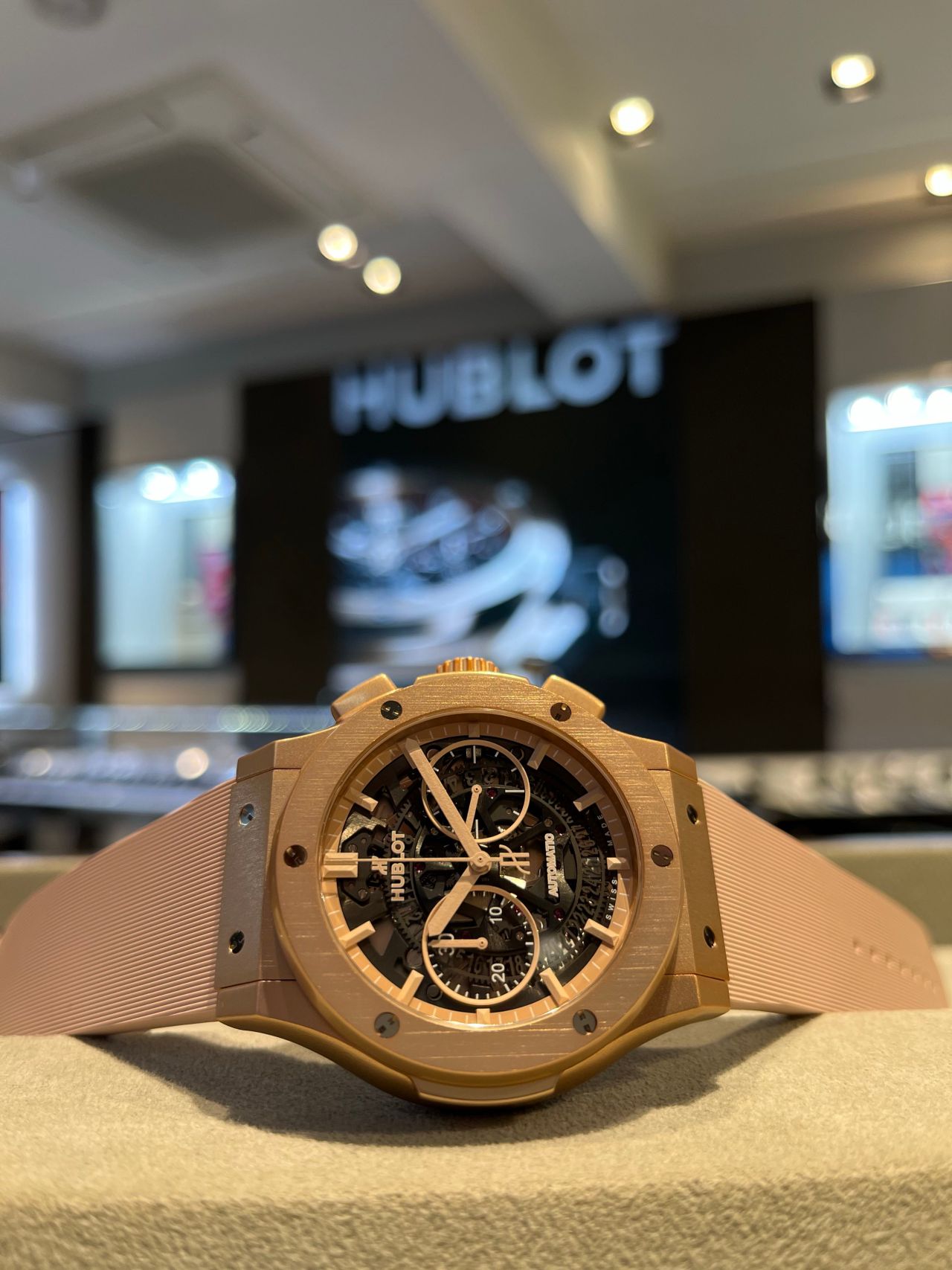 肌なじみも良い柔らかなカラーリングと、スケルトンのダイヤルがHUBLOTらしいアバンギャルドなディテールとなっていて、HUBLOTがお好きな方も、初めての方にも気に入って頂けるスペシャルなウォッチとなっています。