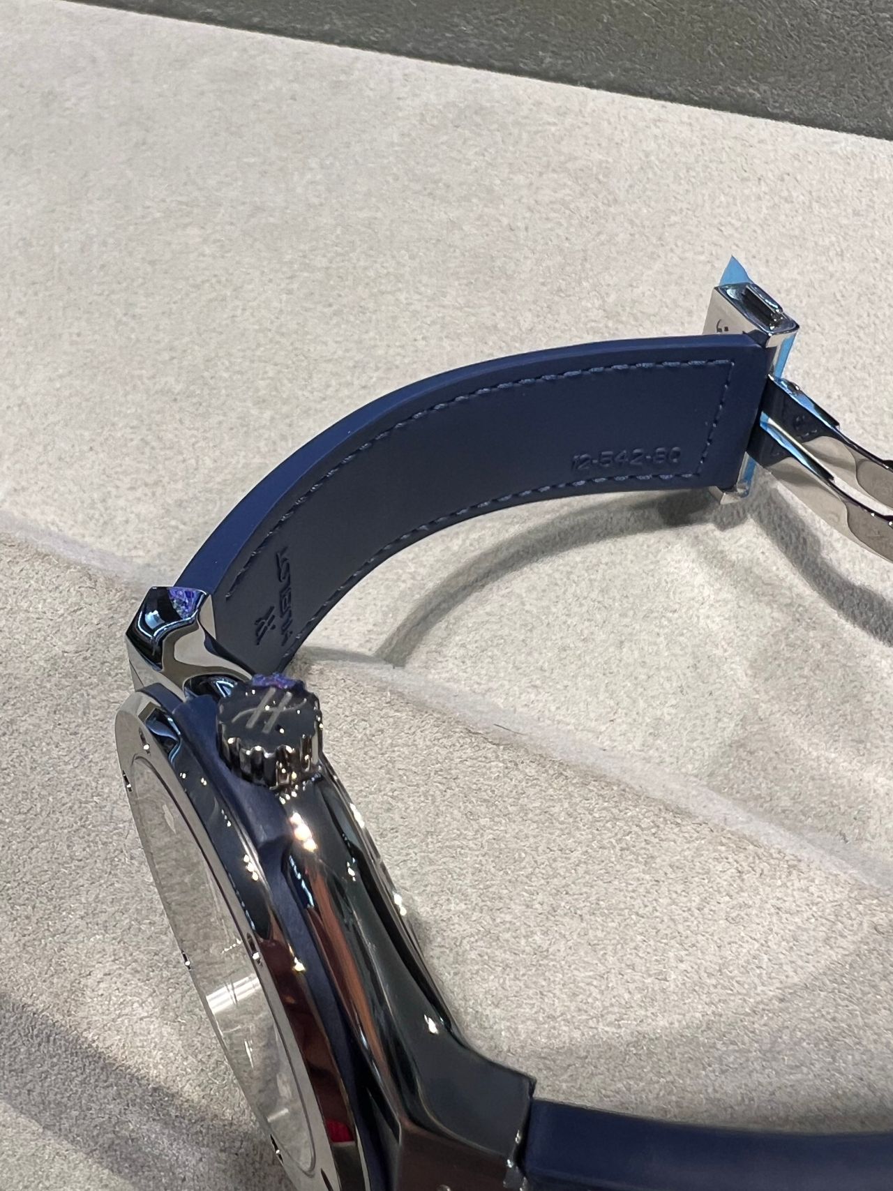 バンドはHUBLOT独自のレザーとラバーのハイブリッド仕様になっており汗の心配も無く耐久性のある作りになっております。