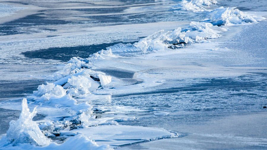 湖が全面凍結し、その一部がせり上がり筋になる現象です。
