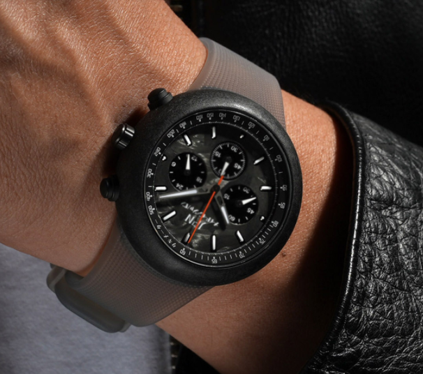 高強度かつ耐候性に優れたカーボンファイバー採用。鉄の1/4の重量で、10倍の強度を持つ。メタルスリーブを使用せずに、風防とケースバックをダイレクトにセッティングすることで、総重量62gという超軽量でありながら10気圧防水を実現しています。