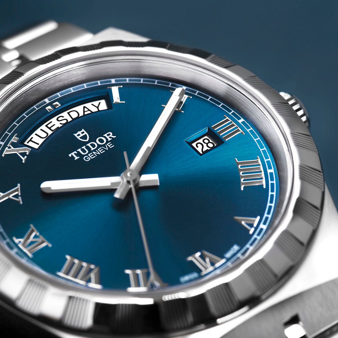 ダイアル:ブルー、サンレイ仕上げ、ローマ数字、12時位置の曜日表示、3時位置の日付表示